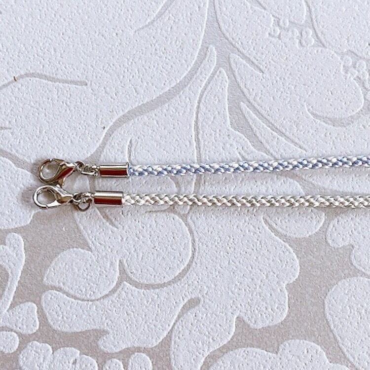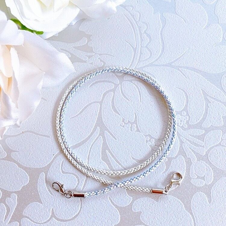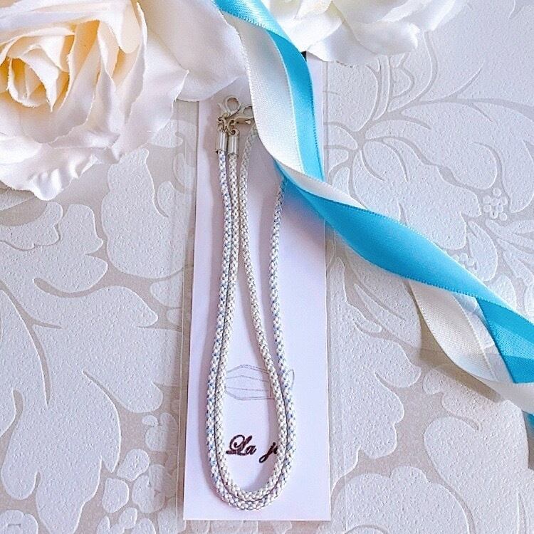 質の良い正絹の糸でつくられた手組みの紐は絹独自の艶やかな素材感、付け心地はとても軽やかで、肩こりや頭痛もちの方にも喜ばれています。また絹はお肌や衣類に優しい素材で知られています。