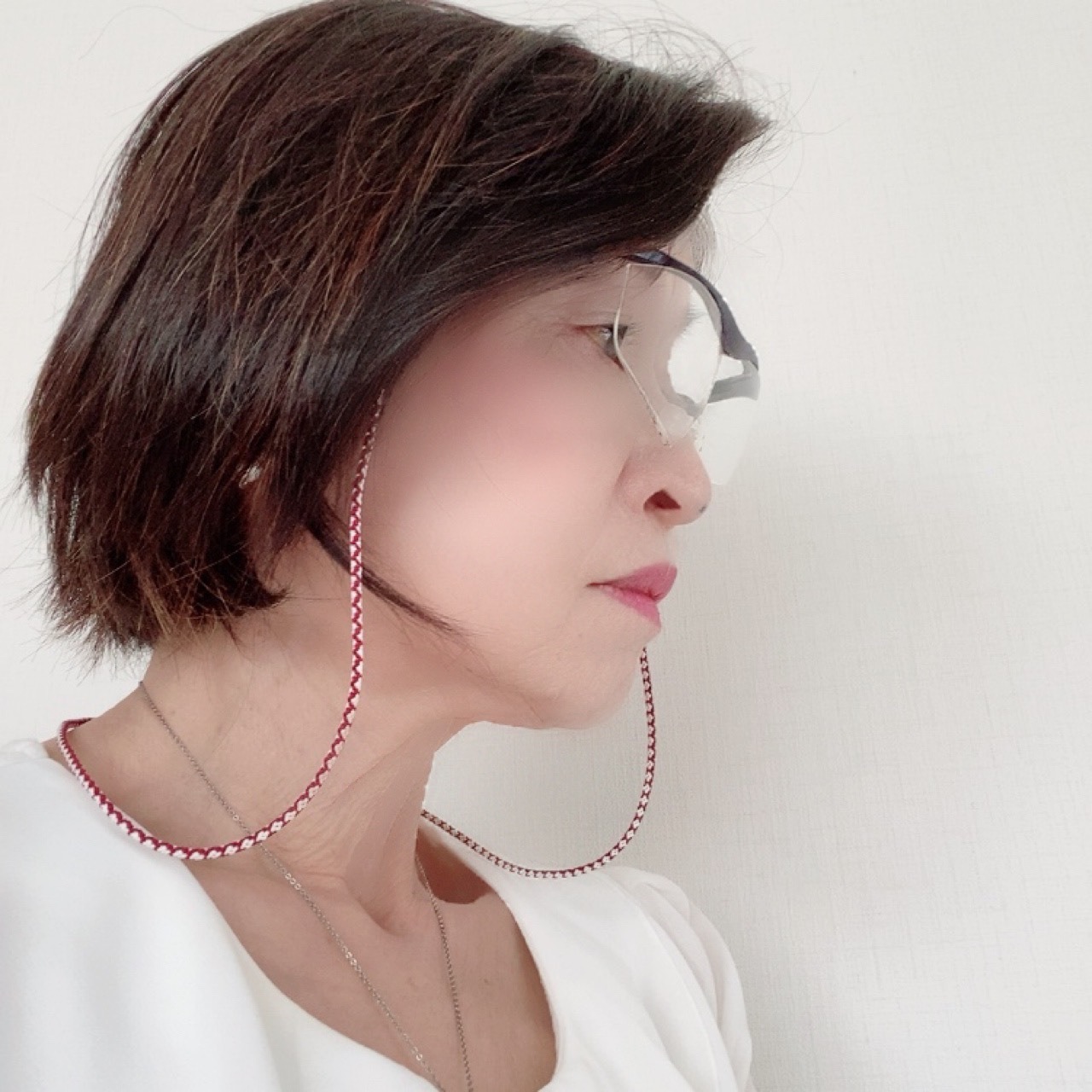 質の良い正絹の糸でつくられた手組みの紐は絹独自の艶やかな素材感、付け心地はとても軽やかで、肩こりや頭痛もちの方にも喜ばれています。また絹はお肌や衣類に優しい素材で知られています。特にこの紐はやわらかく作っているので、敏感肌の方にもお薦めしたい丸組のグラスコードです。