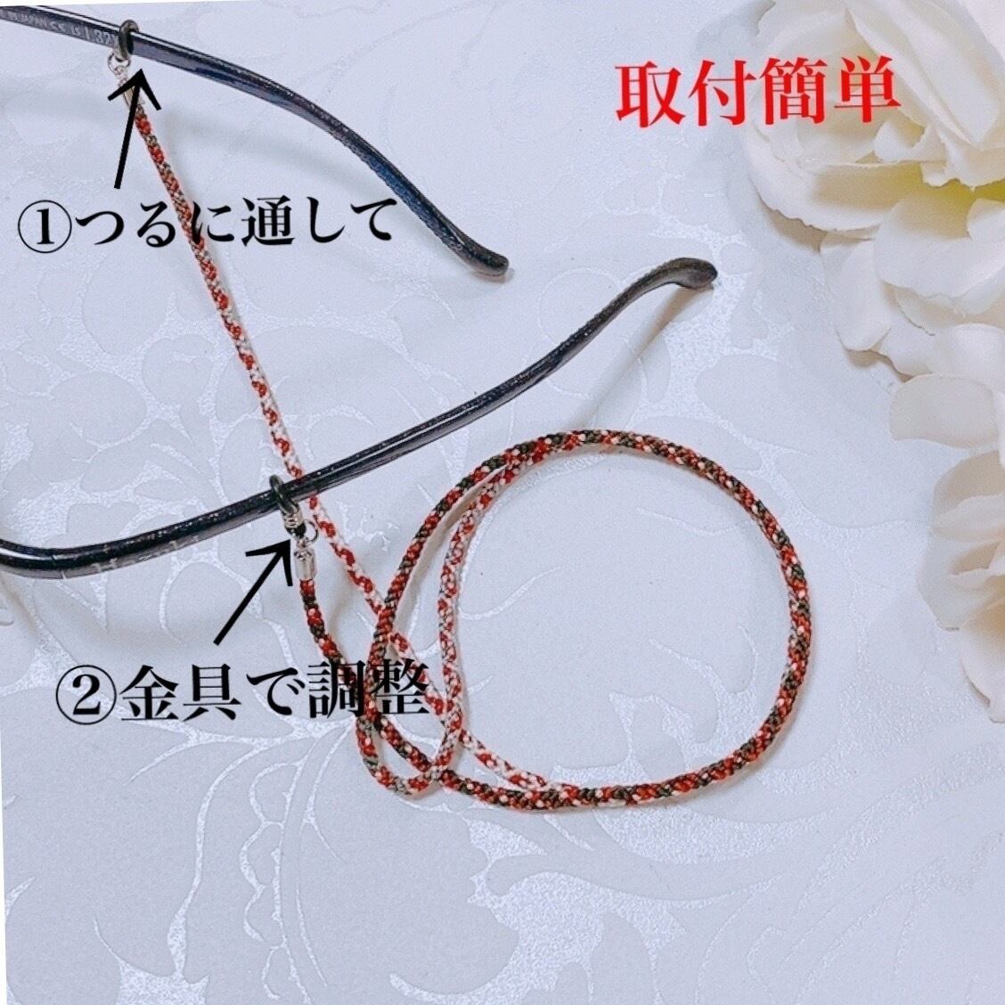 上品で可愛らしい組紐手組みメガネストラップ。