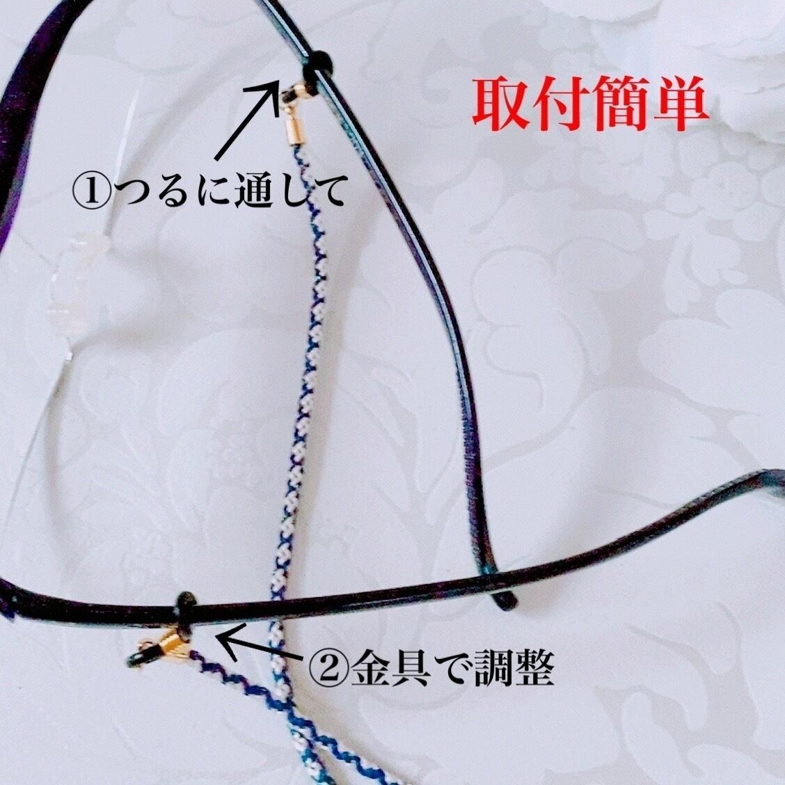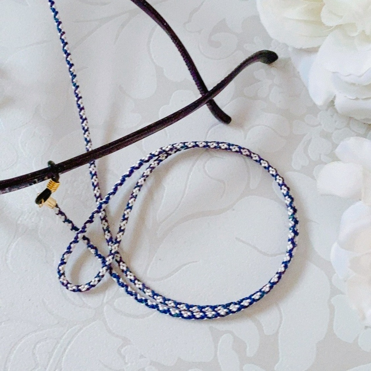 丁寧に手組みされた組紐が、メガネを優しく飾ります。