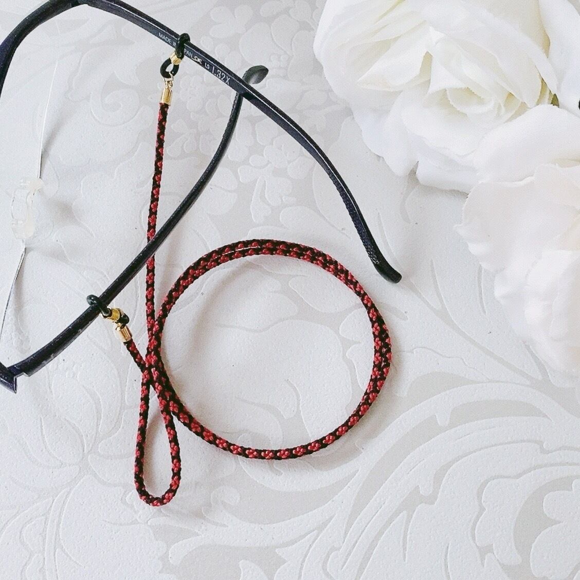丁寧に手組みされた組紐が、メガネを優しく飾ります。