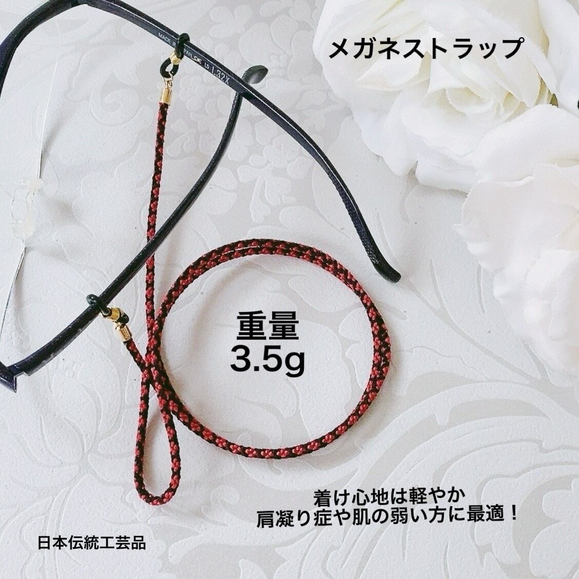 質の良い正絹の糸でつくられた手組みの紐は絹独自の艶やかな素材感、付け心地はとても軽やかで、肩こりや頭痛もちの方にも喜ばれています。また絹はお肌や衣類に優しい素材で知られています。特にこの紐はやわらかく作っているので、敏感肌の方にもお薦めしたい丸組のグラスコードです。